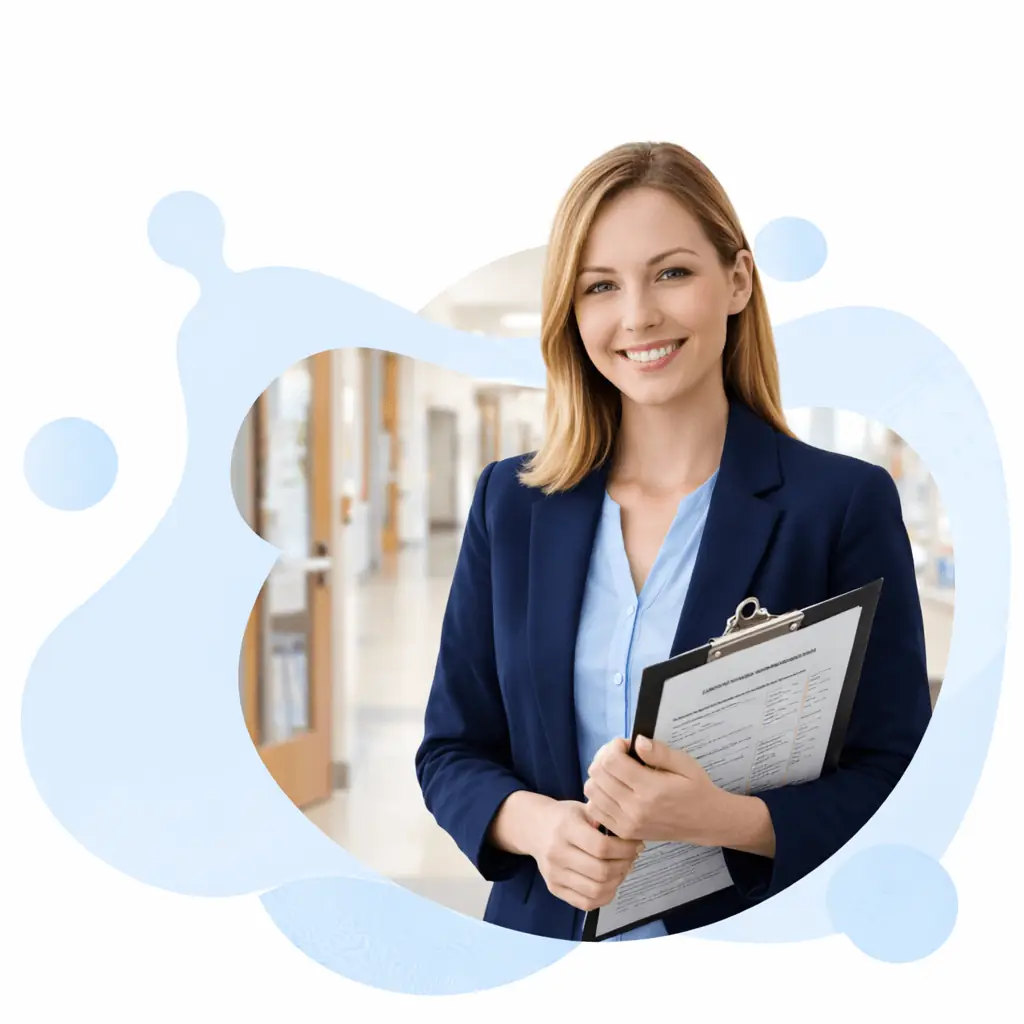 Professional female ESL teacher with fair skin in a modern classroom setting holding a textbook