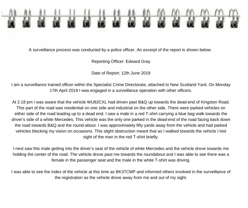 The officer who conducted the surveillance writes in the third paragraph of the report, "I was able to see there was a girl in the passenger seat and the male in the white T-shirt was driving. The vehicle proceeded by me towards the roundabout."