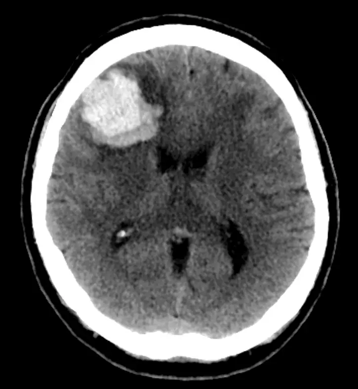 A significant high-density area caused by severe bleeding can be seen in the right frontal lobe in the picture. Since there was no contrast on the CT, this cannot be an enhancing mass.