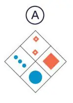 The easiest approach is to start as close to the mirror line as possible and work further away. You can see in this case that there are two circles slightly on top of each other so the answer must be A or D. If you assess the positioning of the outer circles, you can see the answer must be A.