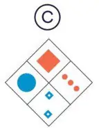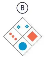 The blue circle is opposite blue stars so it must be B or D. The big square is clockwise of the blue circle so the answer must be D