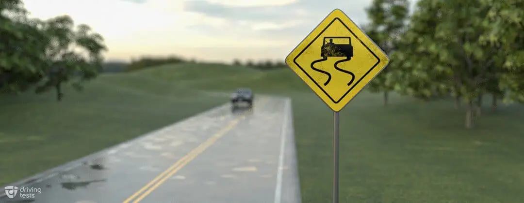 This warning warns that when it's wet, the road may get slick. In precipitation, reduce your speed, extend your following distance, steer clear of sharp turns, and soft-brake. At bridges and overpasses, these signs are frequently erected.