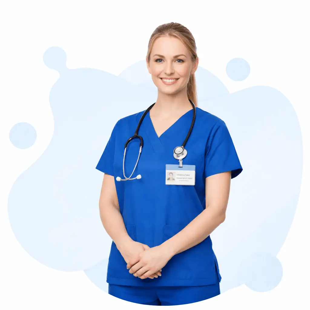 Professional female Certified Nursing Assistant with fair skin in Illinois medical scrubs holding a clipboard, warm confident smile, clean white background, 500x500px, high-quality studio portrait.