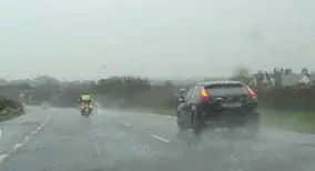 Explantion: In wet and windy conditions, watch out for vulnerable road users being blown into your path.
