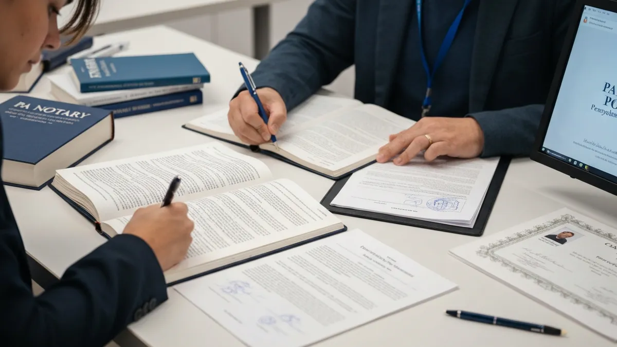 The examination covers Pennsylvania notary law, proper notarial procedures, journal requirements, and ethical obligations. Our resource on how to pass the PA notary exam walks through each tested domain in detail.